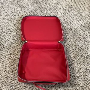 NWOT Red zip up travel bag by Estée Lauder with gold hardware