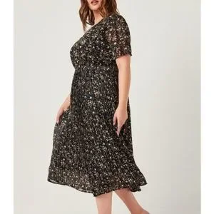 Hayden Pleated Black Floral Printed Short Sleeve Midi Dress. NWT! Sz 2X