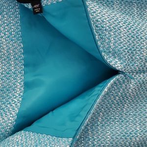 New With Tags: Lovely teal and white blend boucle pencil skirt. Fully lined, back zipper, eye hook closure and kick pleat in back.