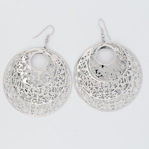 Make a statement with these stunning extra large round dangle earrings. Featuring a 3-layer filigree design and a hollow core, these earrings are lightweight and comfortable to wear. The large circle measures 60mm in diameter and the earrings have an 80mm drop. Made from aluminium, they are available in both silver and gold and are finished with ear hook wires.