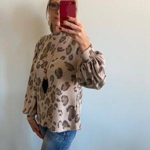 Leopard Print Brushed Hacci Top. Super soft and fun to wear. Boatneck. Long sleeves with puff at the wrist. 78 polyester 18 rayon 4 spandex. I am modeling size Small. Fit is true to size. New boutique item.