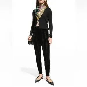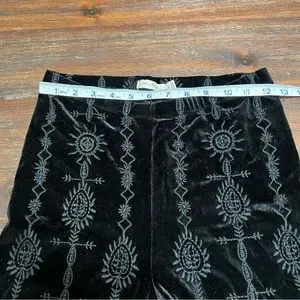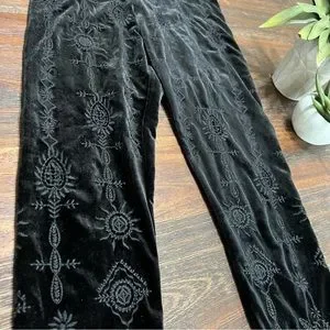 Johnny Was Althea Stretch Tonal Embroidered Velvet Legging Black XS. Only gently worn a couple of times and in excellent used condition. There is stretch to the velvet but not too much due to the embroidery throughout the leggings. I’m typically a 26/27 in jeans, my legs aren’t too skinny and these leggings fit pretty perfectly in my personal opinion.