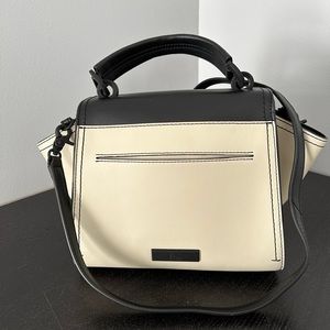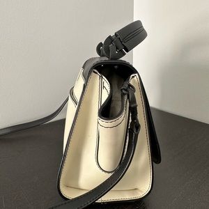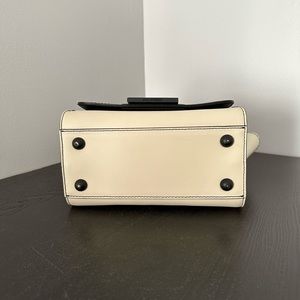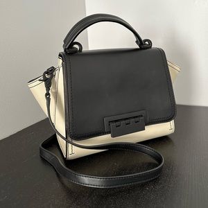 Zac Posen bag - genuine leather. In a ivory/black color block pattern, this bag flaunts a petite structure with fanned design and is topped with a detachable crossbody strap to wear it your way around town.