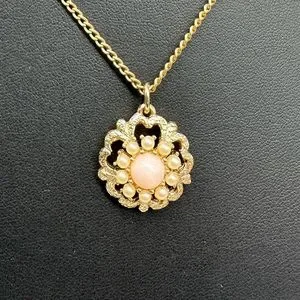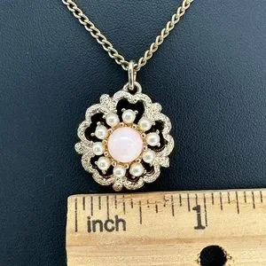 Vintage signed Sarah Coventry Necklace. Faux Pearl Accents Flower Pendant. 17.5-inch gold-tone necklace. SOLD AS IS.