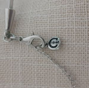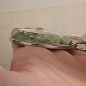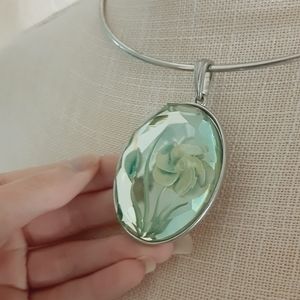This is a silver tone circle necklace with a reflective light green floral pendant from C 1945. Excellent condition. :)
