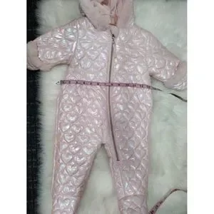 Item Details: Pretty quilted hearts and soft faux-fur trim highlight the snuggly feel of this footed zip-up pram from S Rothschild & CO. Heavyweight Lined Zipper closure at front Faux-fur trim at hood at attached fleece mittens; footed Polyester; faux fur: polyester; fleece: polyester Machine washable Imported