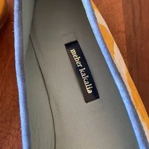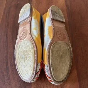 This Bizi Ballet yellow and white leather flat has iconic tie-dye yellow motif, with metal coil embroidery and orange beads. The lining is leather and the sole is leather with a rubber patch. Excellent worn condition.