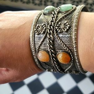 Silvertone metal bracelet with a weaved design. it has green and orange stones, im not sure if its glass or stones. You can squeeze the bracelet gently to get the size you desire.
