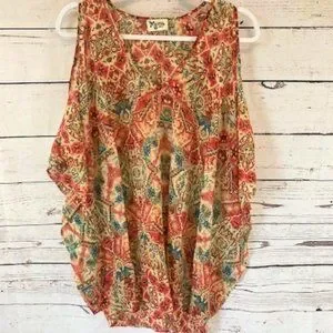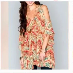 The Peta-Boo Tunic by Show Me Your MuMu spices up your everyday blouse! With cut-out shoulders and a v-neckline, this tunic has the most flattering cut! Multi colors in red, pink, peach, teal, blue & white. Oversized fit.