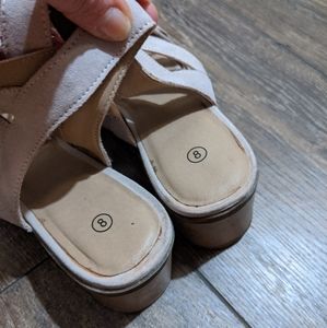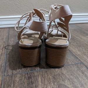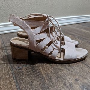 Nude tan suede lace up chunky block cage heels 8 EUC