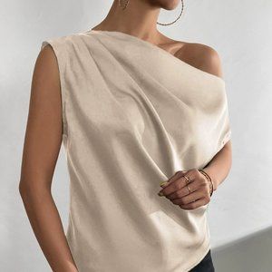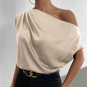 Khaki Boho Womens Asymmetrical Neck Ruched Shoulder Blouse