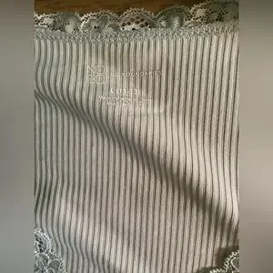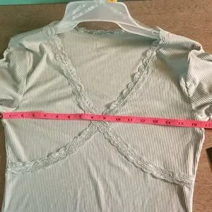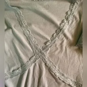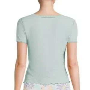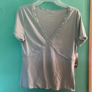 This is a No Boundaries Juniors Lace Trim Ribbed T-Shirt Size Large. Soften up your basics with this Ribbed Top from No Boundaries in Jade Delight (a soft green). Crafted with the comfort of a T-shirt, but so much more, this sweet pullover is trimmed with delicate lace and finished with a lettuce-edge hem to create a feminine and figure-flattering look you can pair with jeans, shorts or capris.