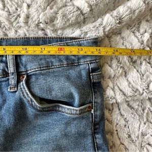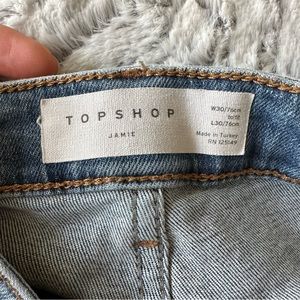 Topshop Jamie Distressed Knee Jeans size 30. Inseam is 25”. Although a size 30 waist measurement is approximately 28”. Ripped knees.