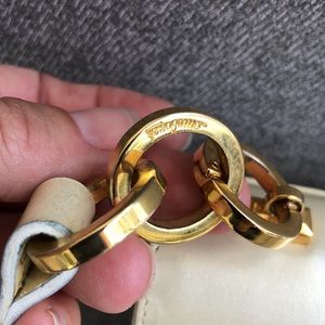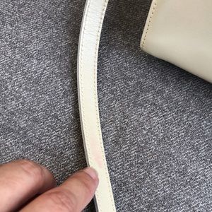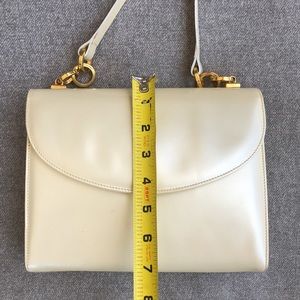 Color: Iridescent Ivory cream leather outer/black leather llining/gold logo hardware
