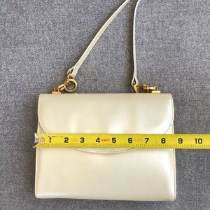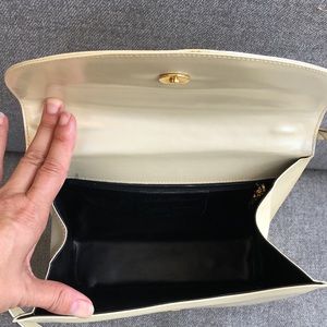 Made in Italy. Iridescent ivory cream leather outer. Fold over flap w/gold magnetic closure. Black leather lining. Interior zip pocket. Gold logo hardware. An absolute beauty!