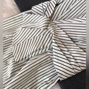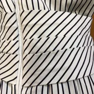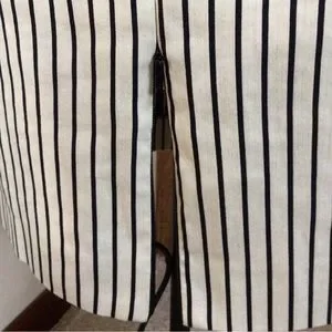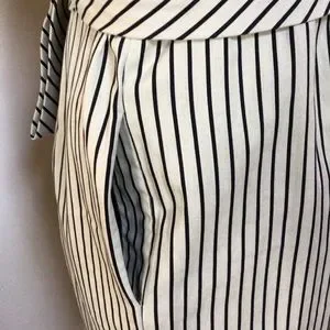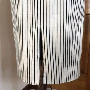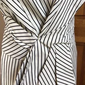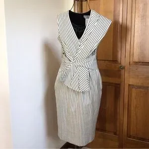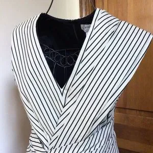 Sportmax by Max Mara Striped Sheath Dress, Size 8, Color neutral with black stripes Striped tailored sheath dress V neck short cap sleeve Asymmetric design Pleated detail Concealed back zip Cncealed zip on the skirt hem for slit look. Fabric: 75% Cotton, 23% Polyamide, 2% Elastane;