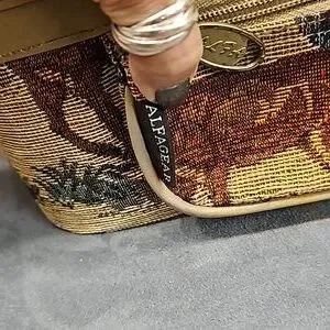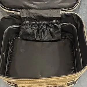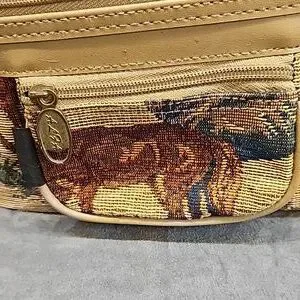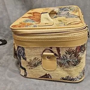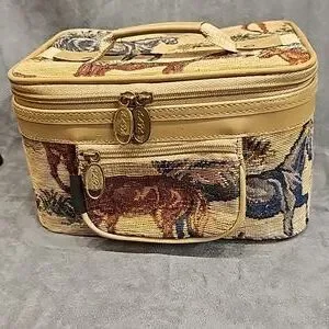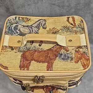 I don't know how vintage this makeup train luggage really is but I know it is at least 15 years old. It has equestrian tapestry print with brown and blue horses. It measures approximately 10" X 7 1/2" X 6". It has a handle on top and rings on side for strap attachment. Strap is not included. It has two keys but no lock. Plastic covering is still in place to protect mirror. Overall, it is in good condition. perfect for cowgirl, horse lover, equestrian or ranch.