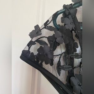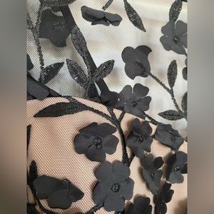 BHLDN nude gown with black mesh overlay, embroidery, and floral appliqué.
