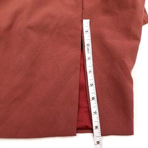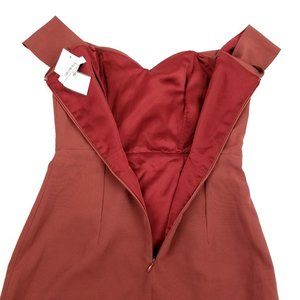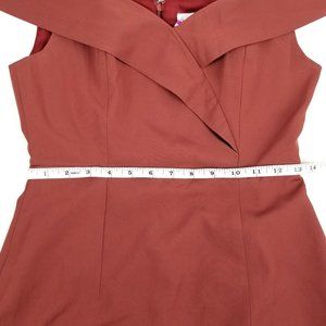 DETAILS: Off the shoulder sweetheart sheath dress. Bardot sweetheart neck. Thigh slit. Brick (rust red)