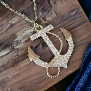 NWT Hand Crafted Rhinestone Anchor Pendant Goldtone Finish Necklace