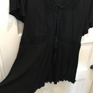 Torrid Size 0 (standard size 12) Flowy, tie front, lace/embroidered detail, gauzy style, flowy style, Summer blouse, 100% Rayon lace 100% Cotton rest of blouse. Excellent used condition. Work only a few times. Measured lying flat B 1/2 in: 35 in W: 38 in L: 26