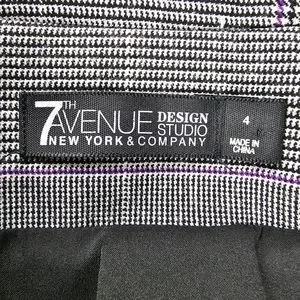 The 7th Avenue Design Studio New York & Company blazer has a black, white and purple plaid design. The blazer features a two button front that can be buttoned with the left or the right button. It has faux flat front pockets and a split in the back. The blazer is preowned and in great condition.