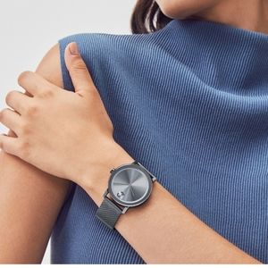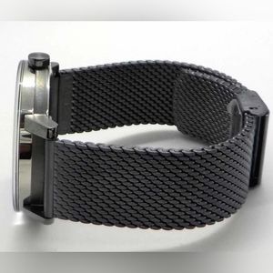 Ultra-modern minimalist design with a sleek, sophisticated finish. Cast in monochromatic military grey ion-plated stainless steel, this bold 40mm case is paired with a timeless mesh bracelet. A matching military grey dial and our iconic dot complete the design.