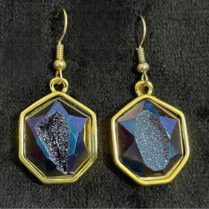 Made to look at the inside of the stone with the "manufactured chip". Deep blue and oh so pretty with a little sparkle. EUC, no flaws, can't wear long earrings anymore. .03 oz and 1" in length.