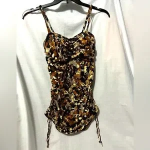 Pretty brown camouflage top adjustable sides to wear short or long built in bra. Bikini bottoms I’m growing in did not come with top. They are no boundaries size large 11-13