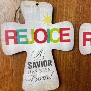1) REJOICE - A SAVIOR has been Born! Cross shape with these words and a star. Approximately: 3.5" W x 4.375" H x.125 D