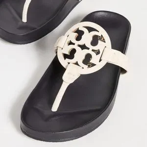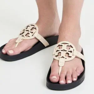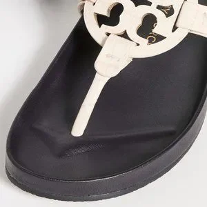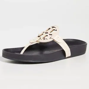 Featuring a carefully contoured footbed for all-day wear, these Tory Burch sandals are a comfortable update to the label's classic Miller slide. Prominent logo emblems and cream-colored leather, they are a stylish, sunny-day slip on you can pair with anything from dresses to denim.