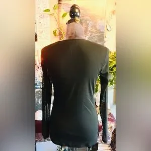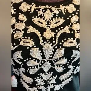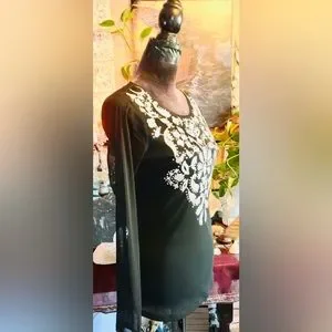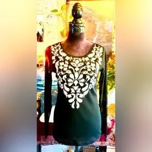 This is a lovely INC nylon mesh and rayon embroidered jeweled summer flow and go blouse with amazing flare can not see through the bust area soft and stretchy...black and white with rhinestones.....tagged size M.....conditon is splendid ............Shoulders 19", Bust 46" overall is 25" long.....Blessings