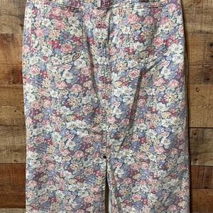 Vintage denim midi skirt. Pencil silhouette. Purples, white, blues & greens floral print. 100% Cotton. Button & zip close front. Pleat front with front pockets. Yoke back with flat jean pockets. Slit back. Vintage size 10. Waist measures 14" across. 21" across at hips. 34" long. Made in the USA. Brand tag is missing. Sandrea Corporation is listed through the RN number. Excellent vintage condition!