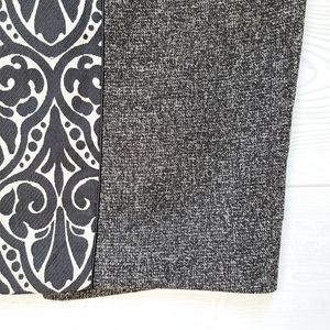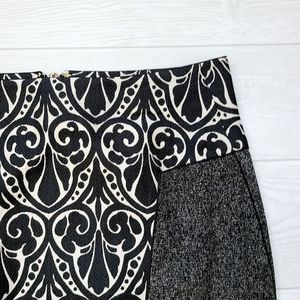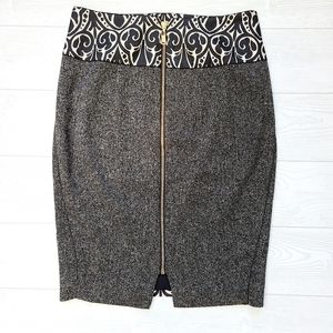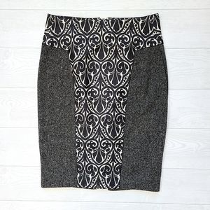 Black-and-white speckled contrast reaches around the sides to visually streamline a moulin crepe pencil skirt. The scroll-print waistband and panel accentuates the sleek styling and a gleaming, full-length back zip creates an unexpected finish.