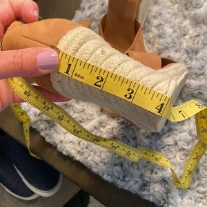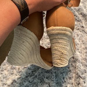 Worn once, leather upper, open toe, wedges. Spot on back right shoes but haven’t tried to clean it. Loved these shoes but looking for a smaller heel.