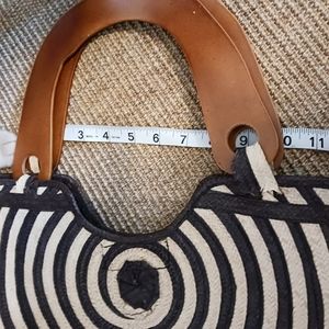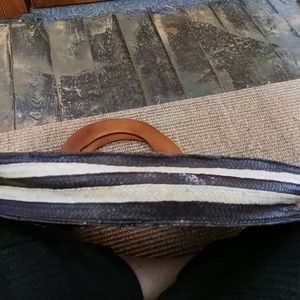 This is a fun shaped summer bag in black and ecru Raffia with fun double wood handles, black interior ligning, inside pocket with zipper and bag has a velcro closure. In great condition. I just bought this from a fellow posher. I am relisting because I forgot I told my girls what I wanted for Mother's Day. Measurements are shown in pictures.