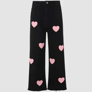 Lookin for love? Look no further! These high-waisted jeans feature a straight leg fit and a graphic heart pattern. Pair with an oversized sweater and boots for a casual look.