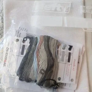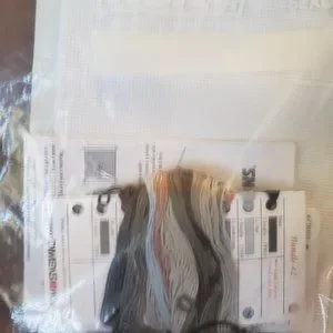 contains cotton thread, 14 count white aida, needle, easy instructions. Fabric 16 x16. 12" Diameter picture.