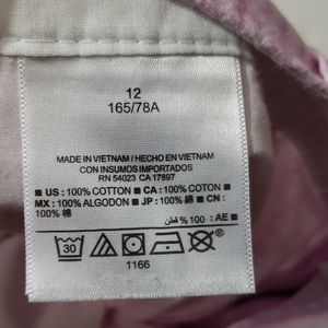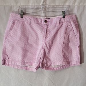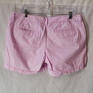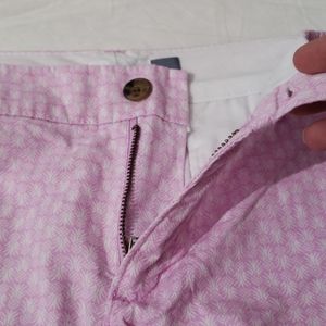 Good used condition. Inseam approximately 5". Front rise approximately 9 1/2". Front slash pockets, back pockets. Colors: pink w/white pineapple motif.