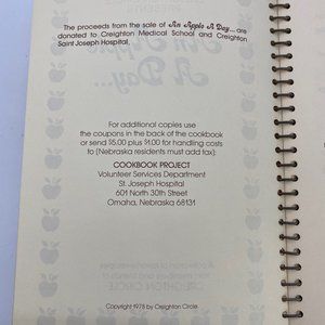 Creighton Circle Presents An apple A Day Cookbook. Published in 1978. No ISBN/LOC. Softcover binder. Cookbook Project St Joseph Hospital, Omaha, NE Dimensions approximately: 6.25 inches W X 8.5 inches H X 1 inch D A Nebraska Charity cookbook with tons of midwestern recipes