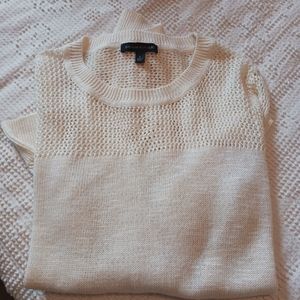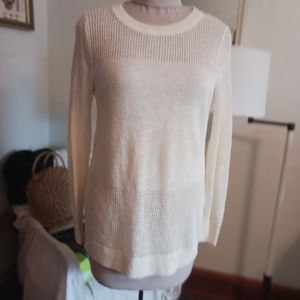 This is a pretty ecru tunic length sweater in 55% linen and 45% viscoise from Banana Republic. It has a crocheted crew neckline, bodice, long sleeves, lower half of front of sweater, and entire back. It has side vents for ease of movement, pullover style, and cuffed sleeve, so they be pushed up and stay up. Pair with linen pants or multi colored wide-leg pant and espadrilles. NWOT/Never worn
