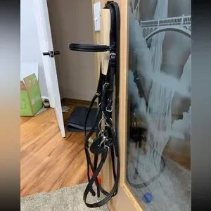 Nunn Finer Figure 8 custom black bridle in excellent used condition. It is a COB sized crown piece & COB sized cheek pieces with a HORSE size noseband — perfect for elevator bits that need shorter cheek pieces. Reins have rubber grip on each side but it is the smaller, more grippy type of rubber. Bridle shows signs of use - especially the reins which have some dirt build up from use. It does NOT come with the bit as shown in the pictures.