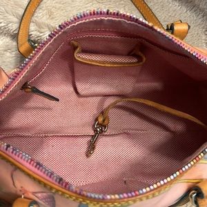 DOONEY & BOURKE BEACH DAY Beautiful Beach Day motif. Rainbow zipper. Clean inside, has two zippered compartments and three open pouches. Logo and authenticity tag is inside. All zippers work perfectly. No rips, tears or scratches. Approximate measurements: 5β x 11β x 5β with 9β handle drop *Patina/water blemish on lower part of left strap but nothing that takes away from the beauty of this vintage gem! Should you have any questions please do not hesitate to ask. Thank you for visiting my closet. π