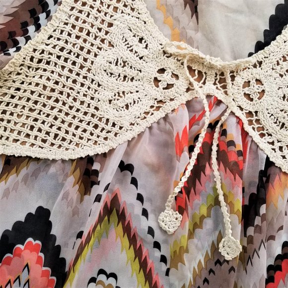 This top has a gorgeous boho vibe, in a tan, brown, coral, chartreuse multi chevron pattern! The beautiful crochet details on the front really sets this top apart! Scalloped crochet hemline. Full sleeves and elasticized cuff. Light & flowy sheer fabric. Great pre-owned condition.