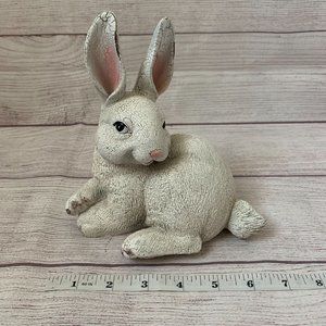 White bunny rabbit figurine. This rabbit is textured to resemble fur. It has a rustic look in areas, such as the nails on the paws and the crackled ears. Intentionally painted to look rustic. It has a pink nose and inner ears. It is pre-owned but in great condition. It has one small chip on the bottom that appears to be more of a manufacturing imperfection. I believe it is made of a resin material, but I am not 100% certain.