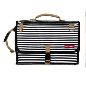 Skip*Hop changing station includes wipes case, front zip pocket, interior mesh pocket, large interior pockets. Attaches to strollers, bags and more.