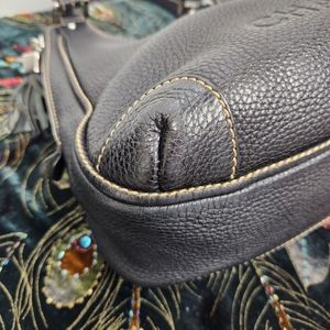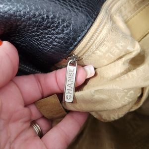 This Black Logo debossed top handle leather chanel bag is in Great condition. No rips tears ..Pretty clean inside other than a few minor spots inside the bag and couple lil ones in pocket..All Zippers work Great. hardware been polished..w some light scratches. Has 1 inside zipper pocket. Drop length approx 8 inches can be carried on the shoulders too.Authentic. Comes w Box and tissue paper. Comes w a COA..BUY WITH CONFIDENCE!!