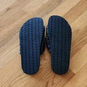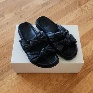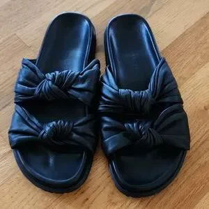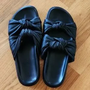 Black very soft Italian leather with twin knot strap across bridge of sandals.