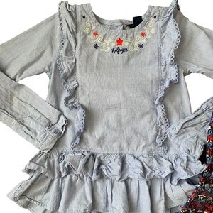 Chambray long sleeve shirt with ruffles and embroidery