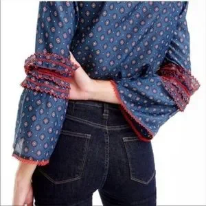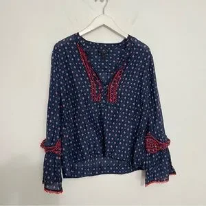EUC-J Crew Embroidered Bell Sleeve Top Blue Red Printed Long Sleeve Blouse